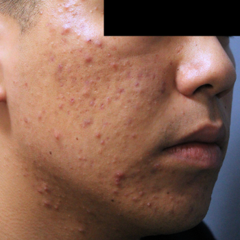 両頬に深いローリング、アイスピック、ボックスカー型のニキビ跡が見られます。