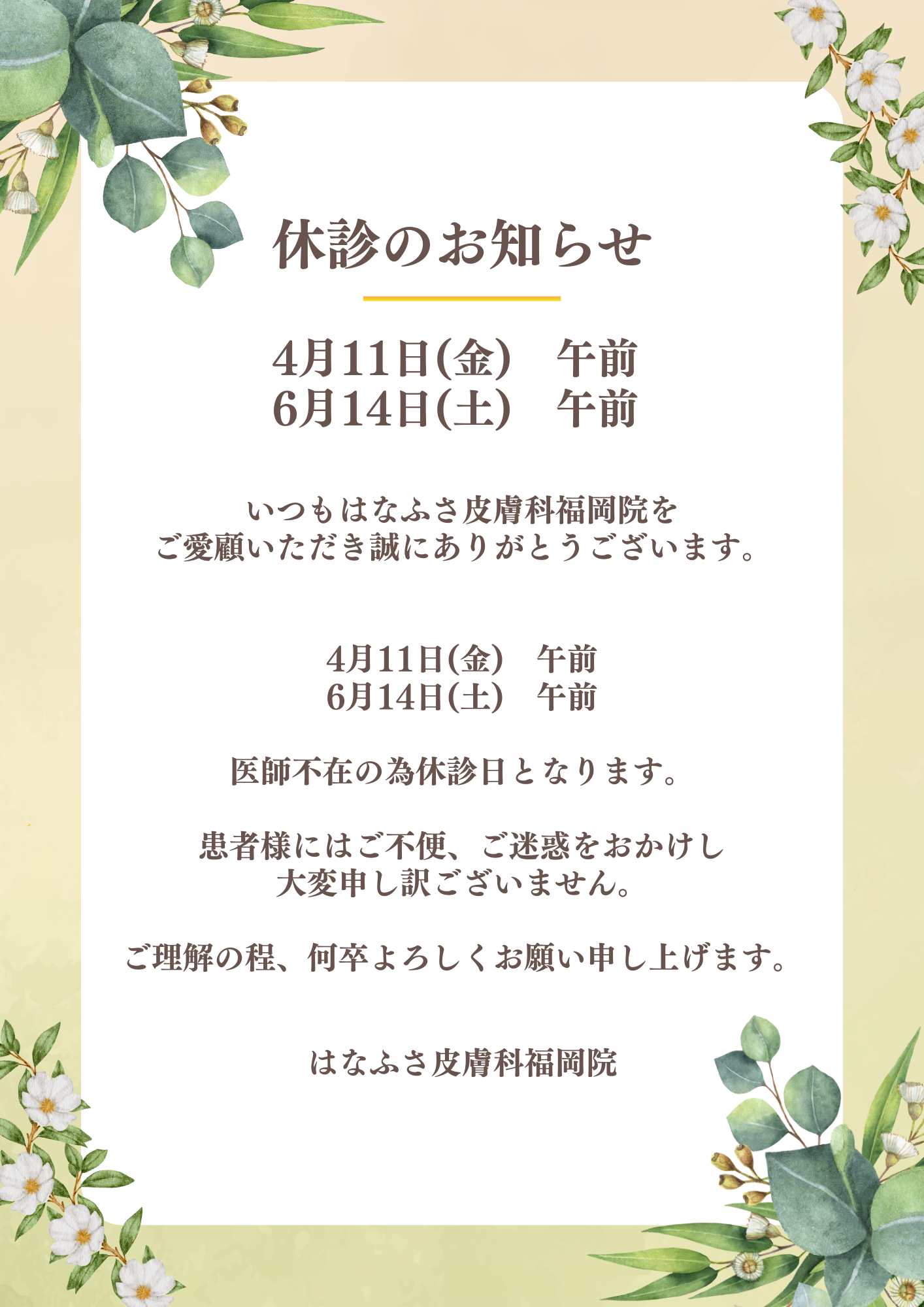 はなふさ皮膚科福岡院の休診のお知らせをいたします。