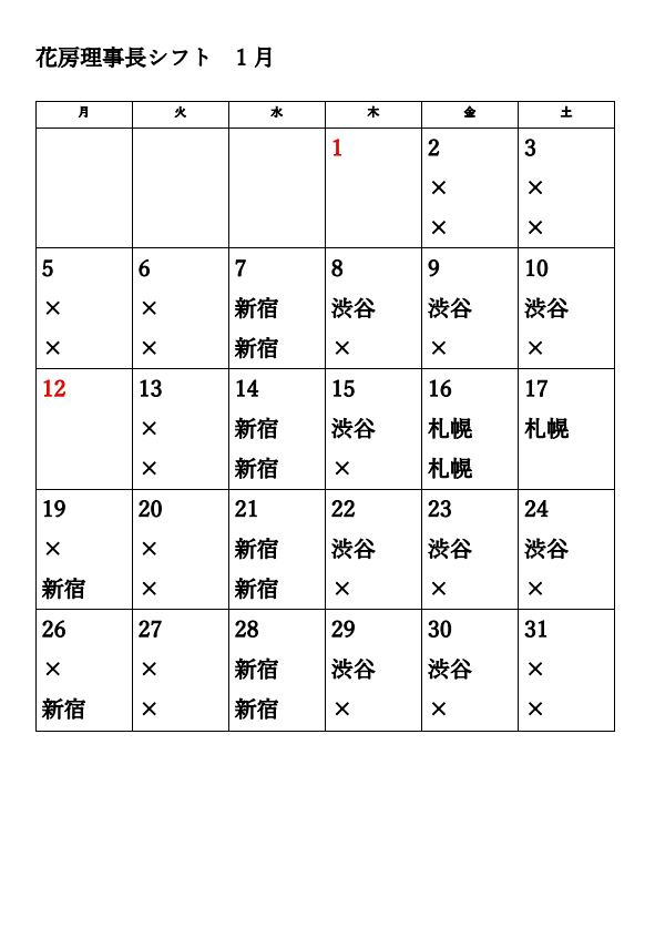 令和8年1月 理事長 花房火月のスケジュールをお知らせいたします。