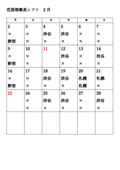 令和8年2月 理事長 花房火月のスケジュールをお知らせいたします。