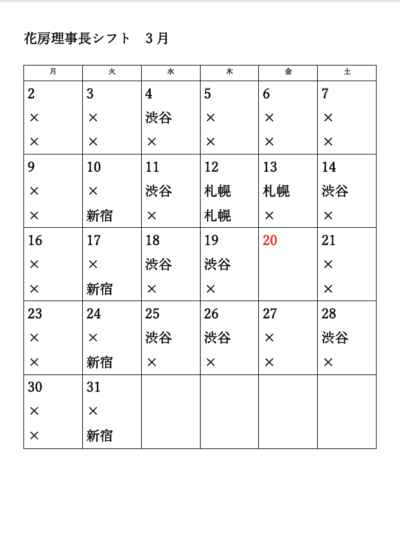 令和8年3月 理事長 花房火月のスケジュールをお知らせいたします。