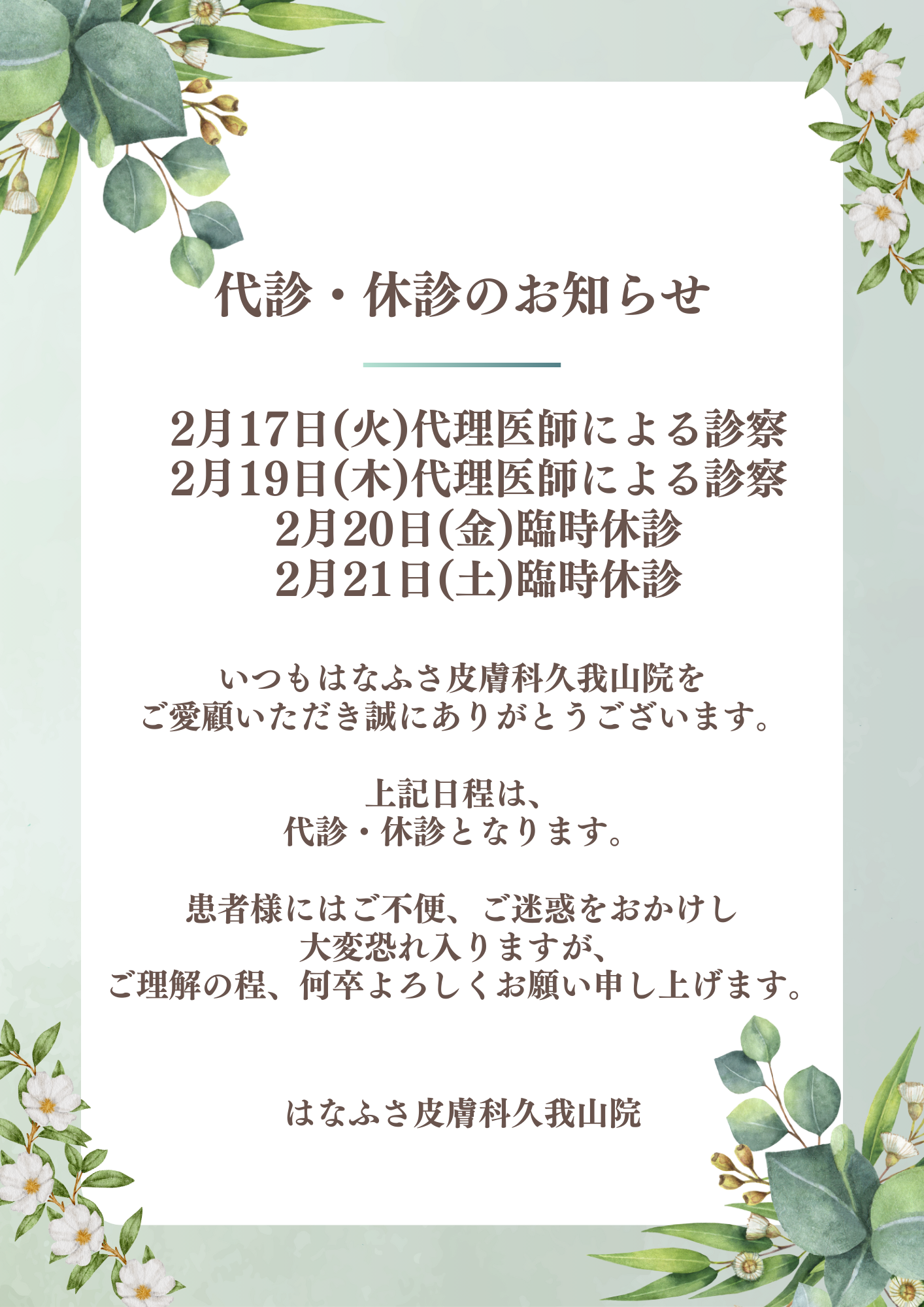 はなふさ皮膚科久我山院の代診・休診のお知らせをいたします。誠に勝手ながら、下記日程は代診・休診をさせていただきます。