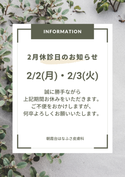はなふさ皮膚科朝霞台院の休診のお知らせをいたします。誠に勝手ながら、下記日程は休診をさせていただきます。