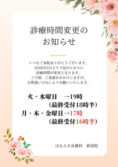 いつもはなふさ皮膚科新宿院をご愛顧いただき、誠にありがとうございます。