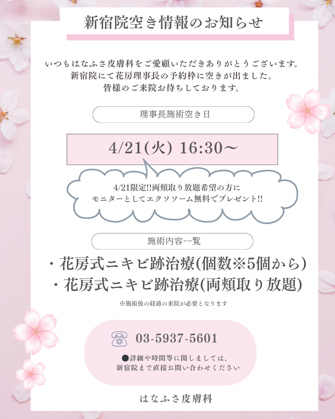 はなふさ皮膚科新宿院 花房理事長 施術枠の空き情報をお知らせいたします。